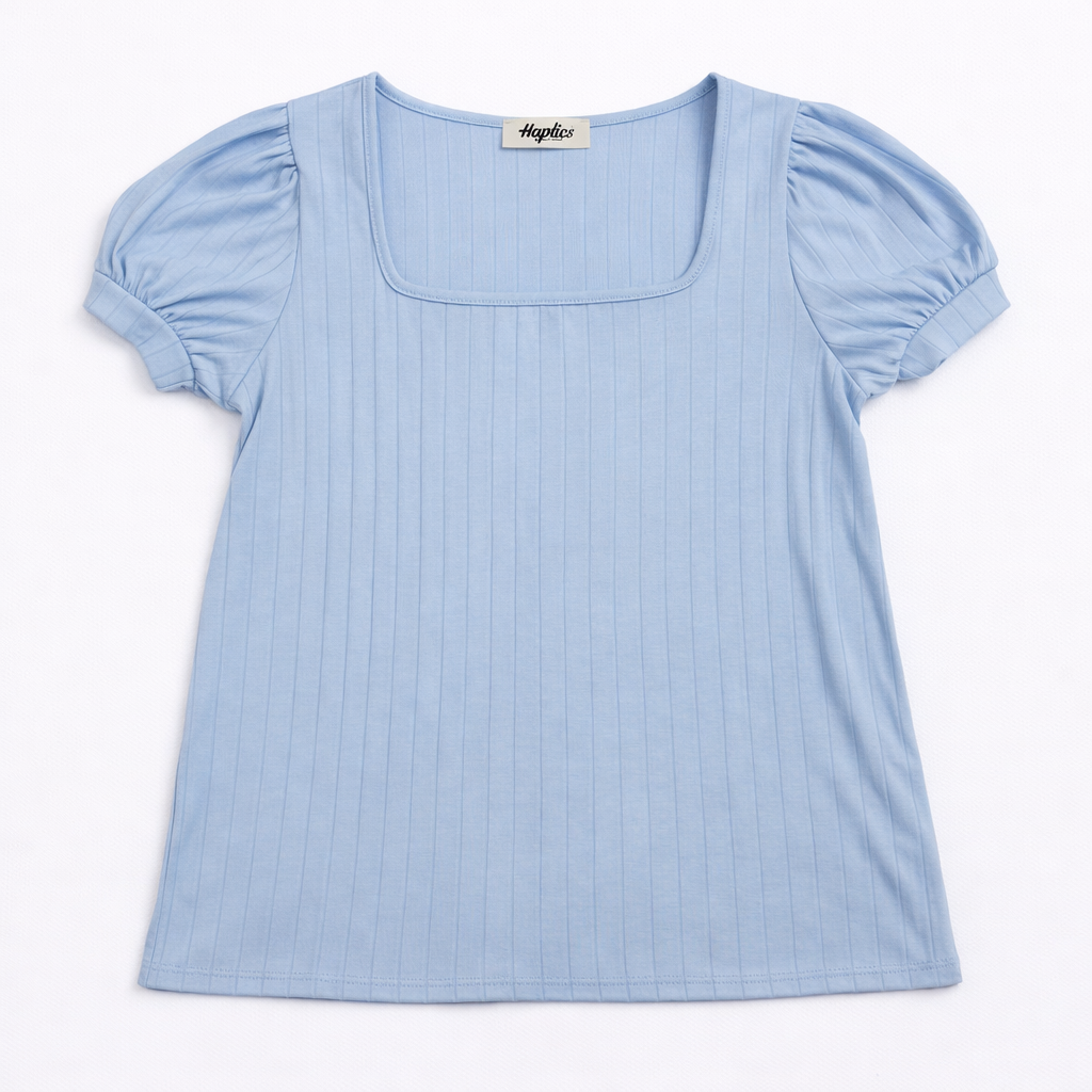 Soft, flattering, and easy to wear, this light blue fitted top is a go-to everyday essential. Designed with a wide ribbed texture and subtle bubble short sleeves, it adds just the right amount of detail while still keeping things simple and versatile. The fitted silhouette hugs comfortably without feeling tight, making it perfect for layering or wearing on its own.