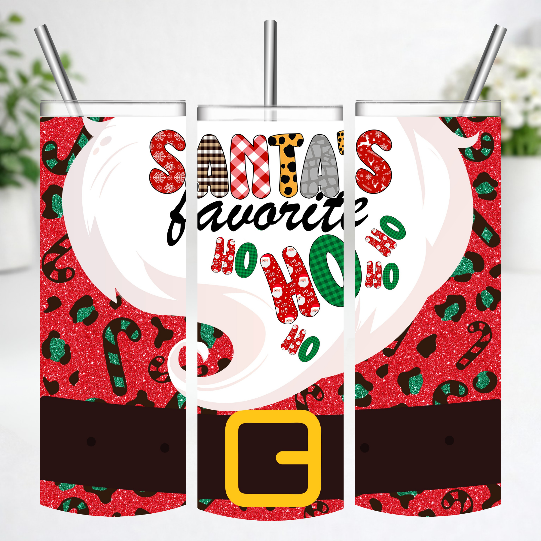 This cheerful holiday tumbler features Santa’s iconic beard and belt with a fun mix of festive patterns, candy canes, and bold holiday colors. The playful “Santa’s Favorite Ho Ho Ho” design makes it a perfect Christmas gift or seasonal drinkware for spreading holiday cheer all winter long.