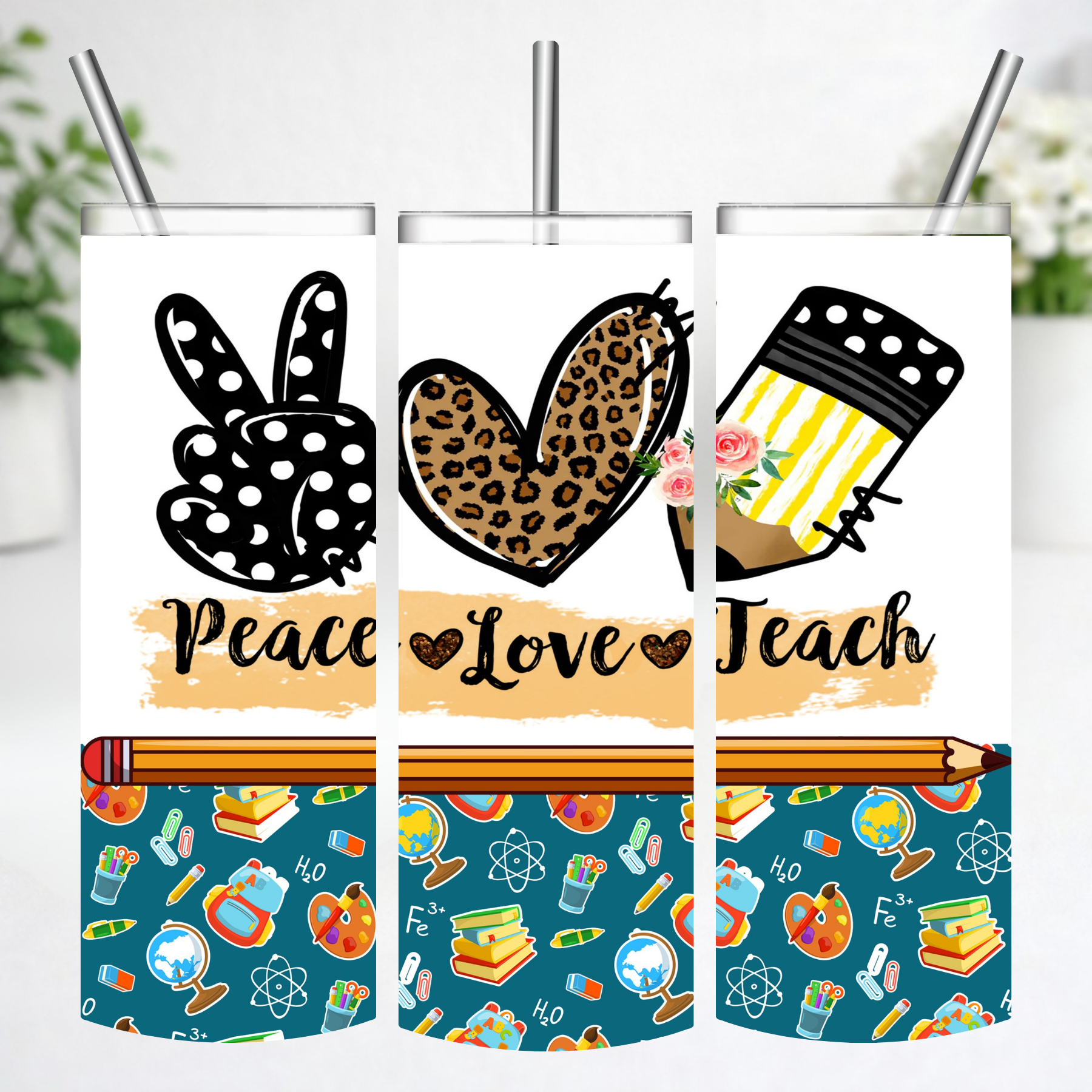 This fun and stylish tumbler features a playful mix of classroom-inspired graphics including a peace sign, leopard print heart, pencil design, and colorful school icons. With the phrase “Peace Love Teach,” it’s the perfect everyday drinkware for teachers who bring passion, creativity, and positivity into the classroom.