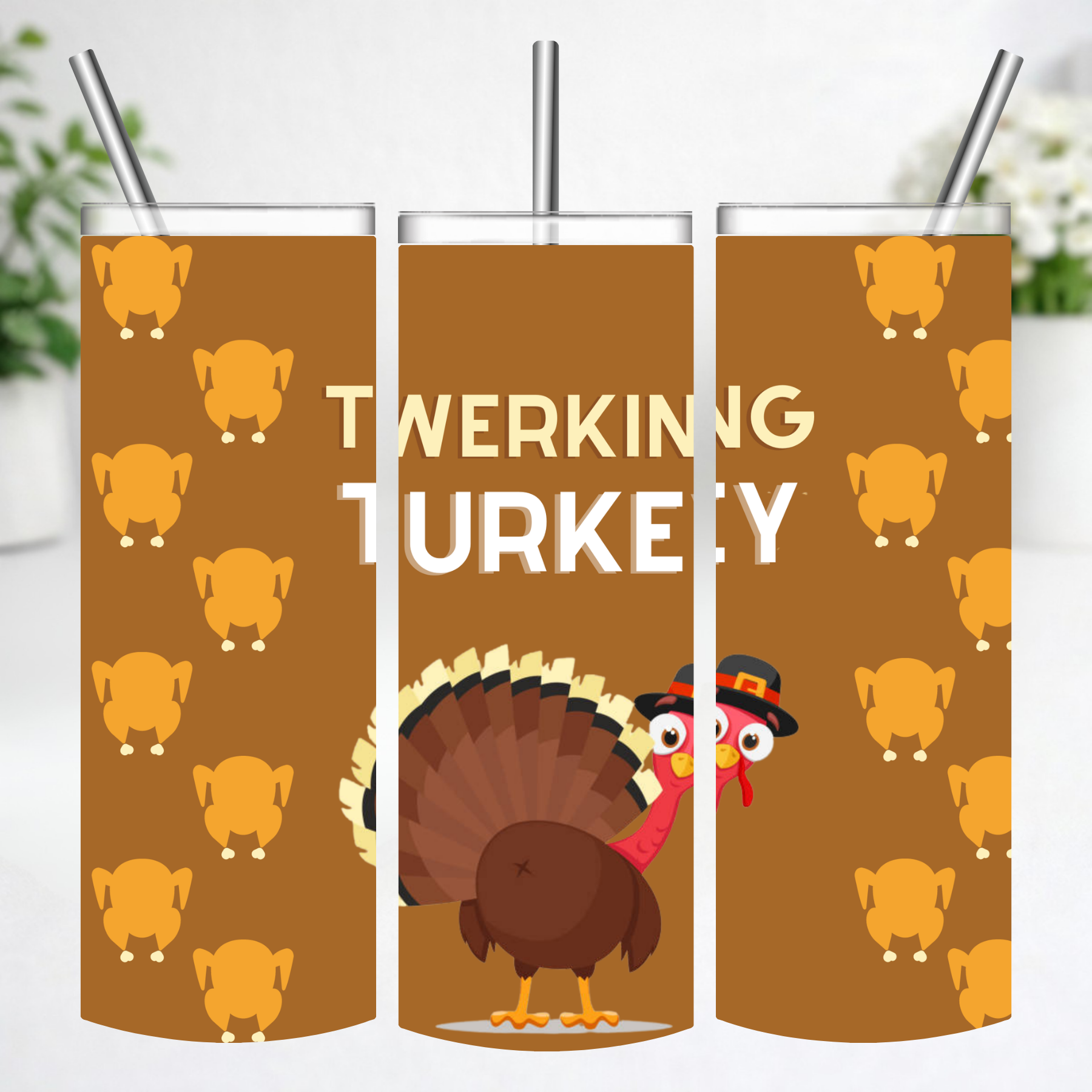 This playful Thanksgiving-themed tumbler features a fun cartoon turkey wearing a pilgrim hat alongside a bold “Twerking Turkey” design and adorable roasted turkey icons scattered across the background. It’s the perfect mix of festive and funny—great for bringing laughs to Thanksgiving gatherings, Friendsgiving parties, or cozy fall days.